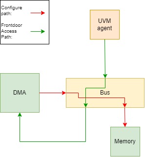 In UVM there are two ways of connecting the register model to UVM agents that operate on the design under test. One is using the register adapter, uvm_reg_adapter. What that class does is to convert from a register model sequence item to a sequence item that can be used by our UVM agent’s sequencer. That works well if there is a one-to-one relationship between the register access and the transactions of the UVM agent. When we need a more complex use of the UVM agent to facilitate the register access, the register adapter falls short. This might be in cases when the source of the register access is not the UVM agent we are using, but it originates from somewhere inside the design under test which we only have indirect access to. Think about a DMA inside a larger system, where we use the UVM agent to configure the DMA to do the access we want. To do this we would need to map the register access to a series of transactions from the UVM agent. In those cases, the UVM register frontdoor sequence, uvm_reg_frontdoor, is the king.