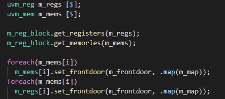 In the picture above you will see how recognizable the uvm_reg_frontood sequence is, with the body task where the work is done. This is where you will assemble the sequence items and send them to the driver using the send_request function. You also see that in my example the kind variable of the rw_info element is used to decide whether the transaction is a read transaction or not. What is next is that we need to connect the frontdoor sequence to the register model and to the sequencer of the UVM agent it is using. As opposed to the register adapter there is not any shortcut to connect the front door to all memories and registers in the register model. So, the user have to do it manually. I recommend this method for doing it: