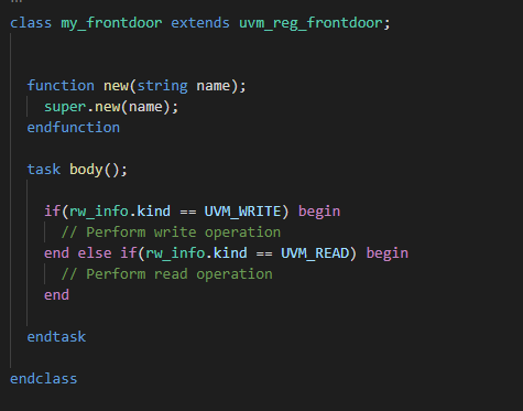 The uvm_register_frontdoor looks like a normal uvm_sequence apart from having the uvm_reg_item rw_info that holds information about the register access. Like if the access is read or write, what the address offset of the access is and a handle to the reqister or memory the access was made to.